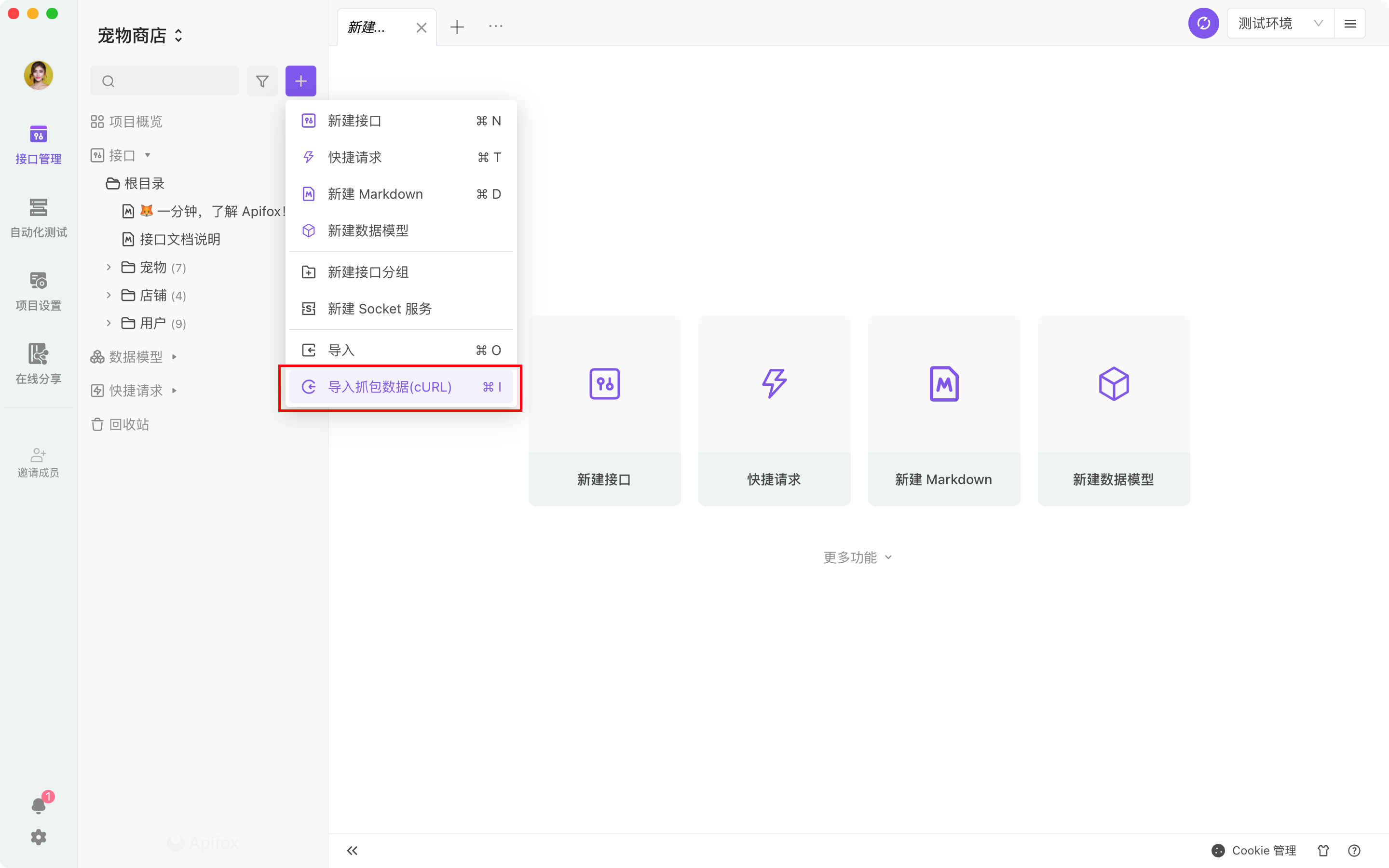 Apifox 支持快速导入 Chrome、Charles 或 Fiddler 等工具中的抓包数据。