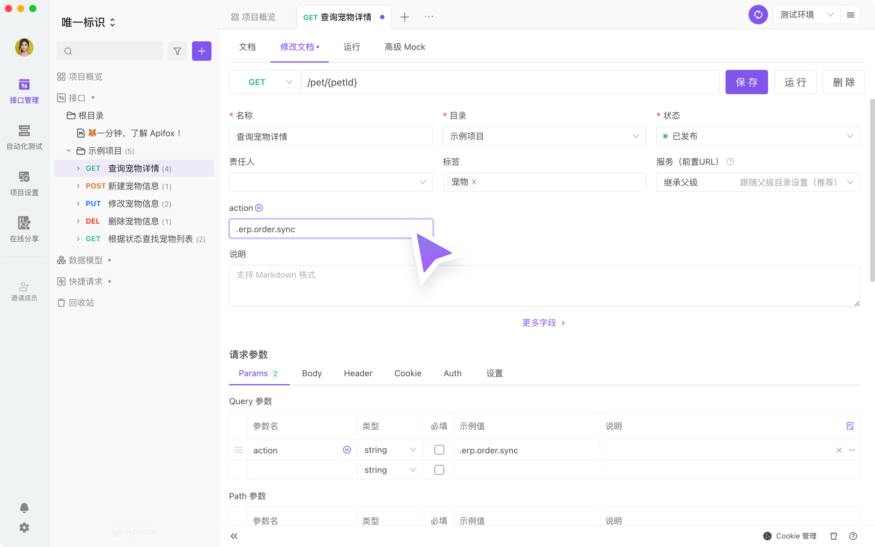 举例:某一个电商 API 接口,以 Query 参数 的参数 action ,作为 接口唯一标识 的参数。如下页面,导入 Apifox 时,点击编辑 修改 接口唯一标识。