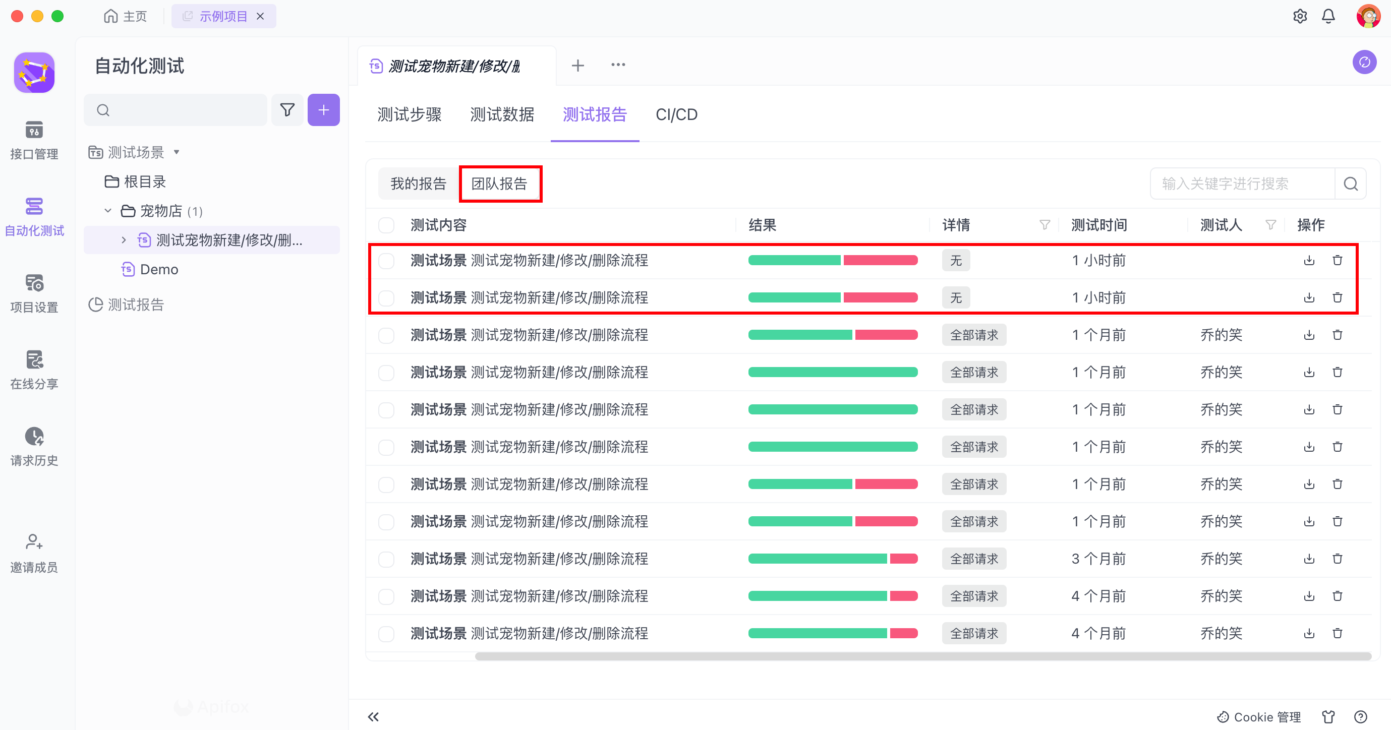 在“测试报告”中的“团队报告”一栏中进行查看。由 CLI 上传的测试报告,测试人一栏中将显示为空。