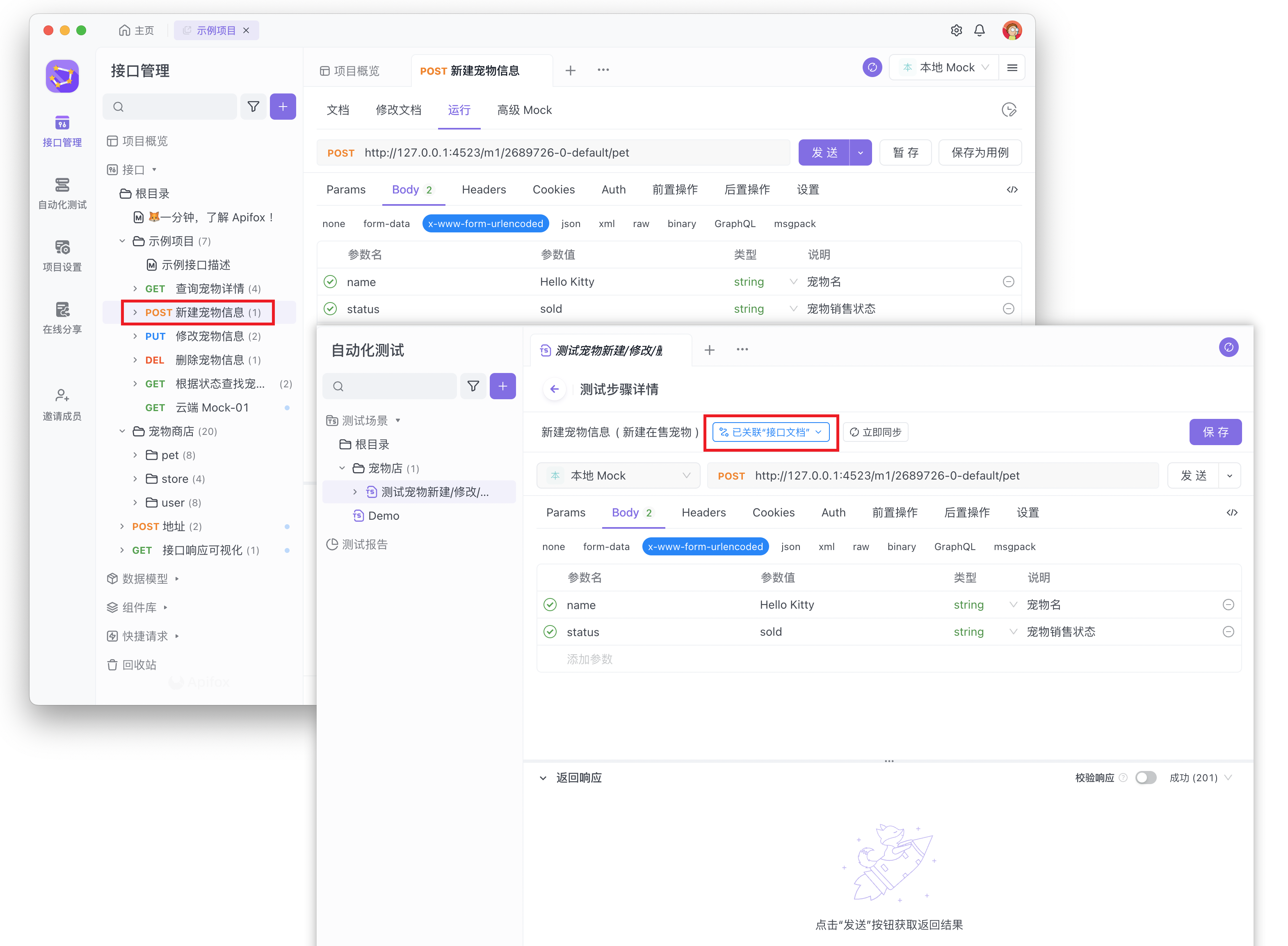 自动同步模式适合小团队或独立开发者场景,即一个项目中的接口定义、研发、测试流程均由一个角色负责,提升接口维护与测试的效率。当「接口管理」中的接口文档/用例发生变动时,测试步骤中的接口文档/用例数据也将联动调整,确保「接口管理」和「自动化测试」中的数据相一致。