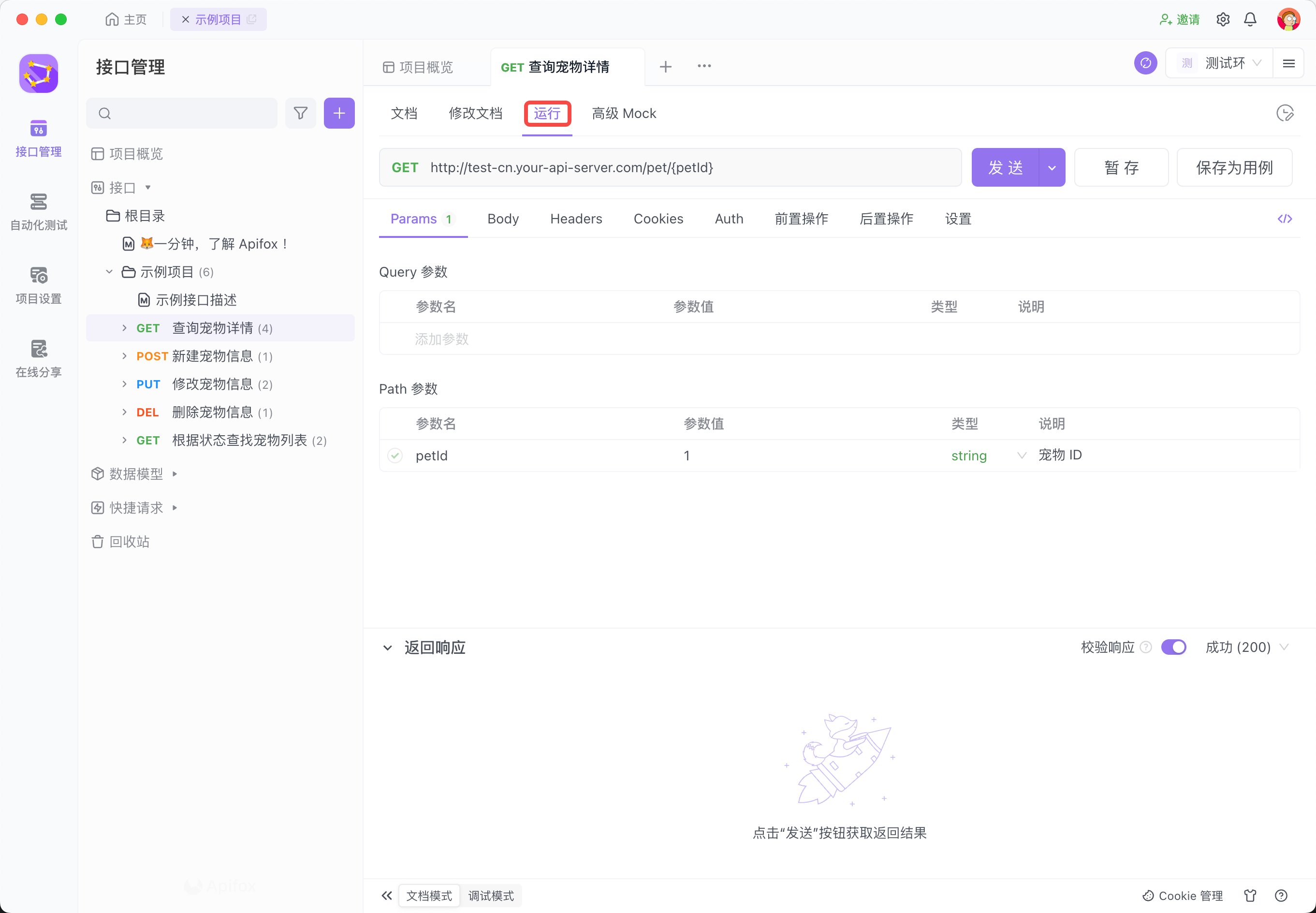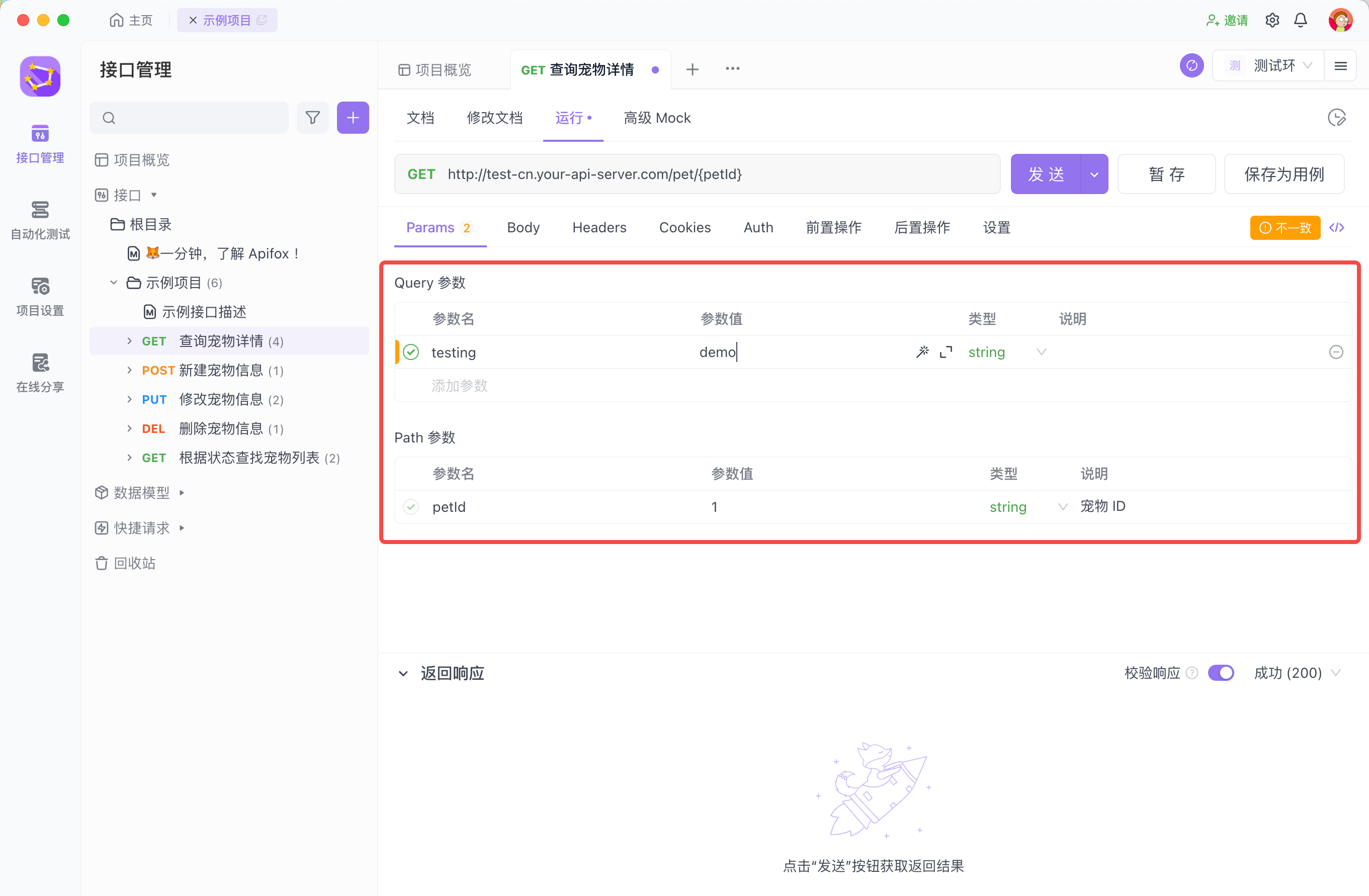 - 得到返回响应。你可以将请求的参数暂存接口,方便反复调试。