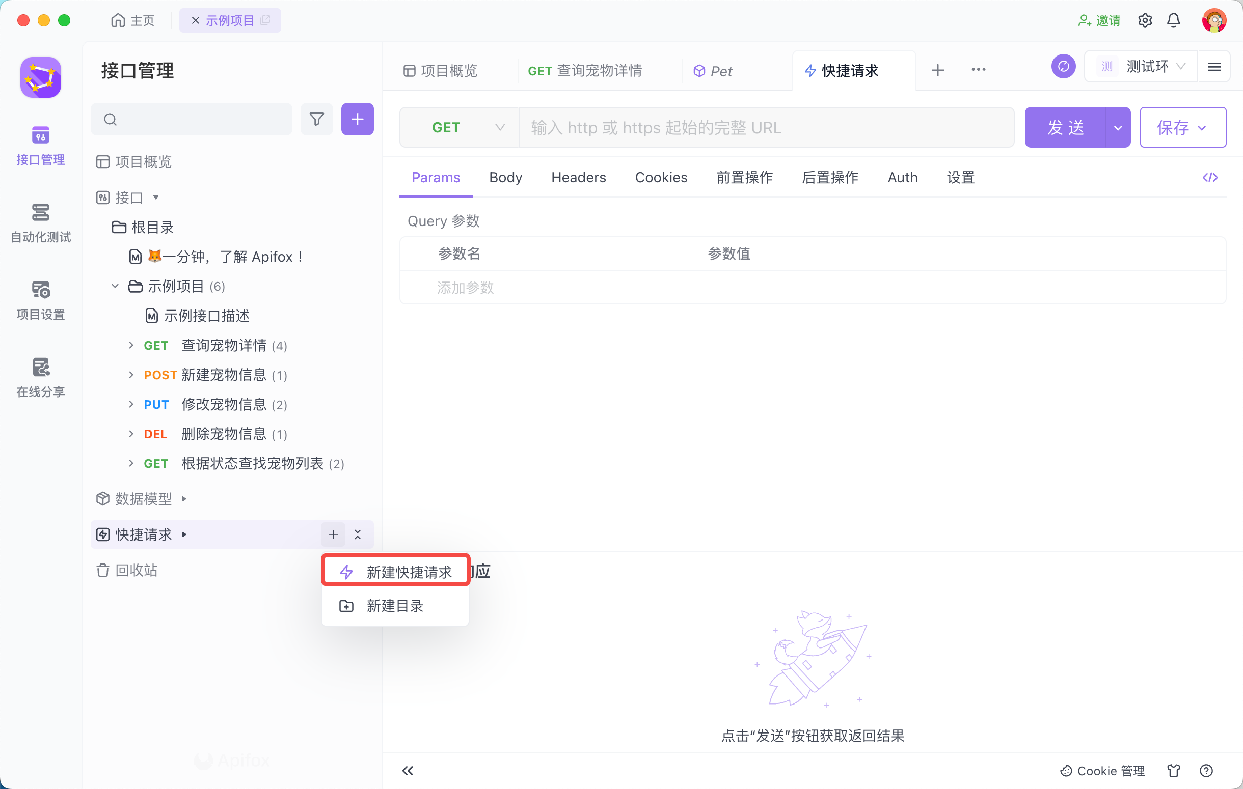 快捷请求常用于调试外部接口,无需创建接口文档便能够快速发起请求并得到响应结果。你可以阅读《快捷请求》了解更多。
