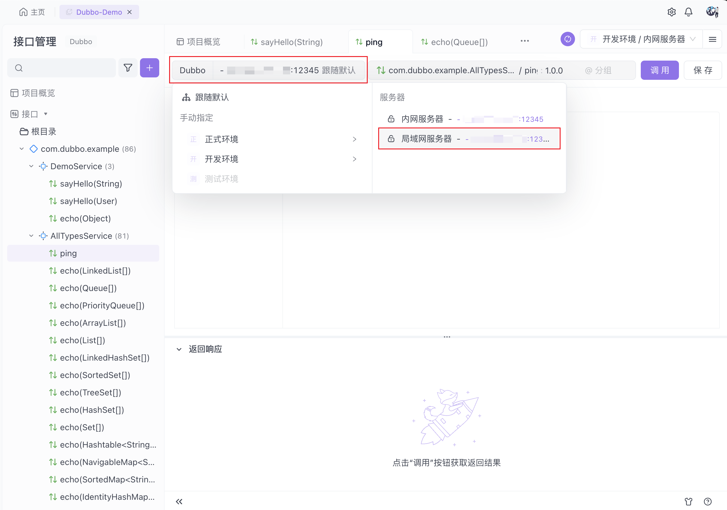 在右上角指定刚刚配置的服务器地址,项目内的其它 Dubbo 接口也将会默认采用该地址。