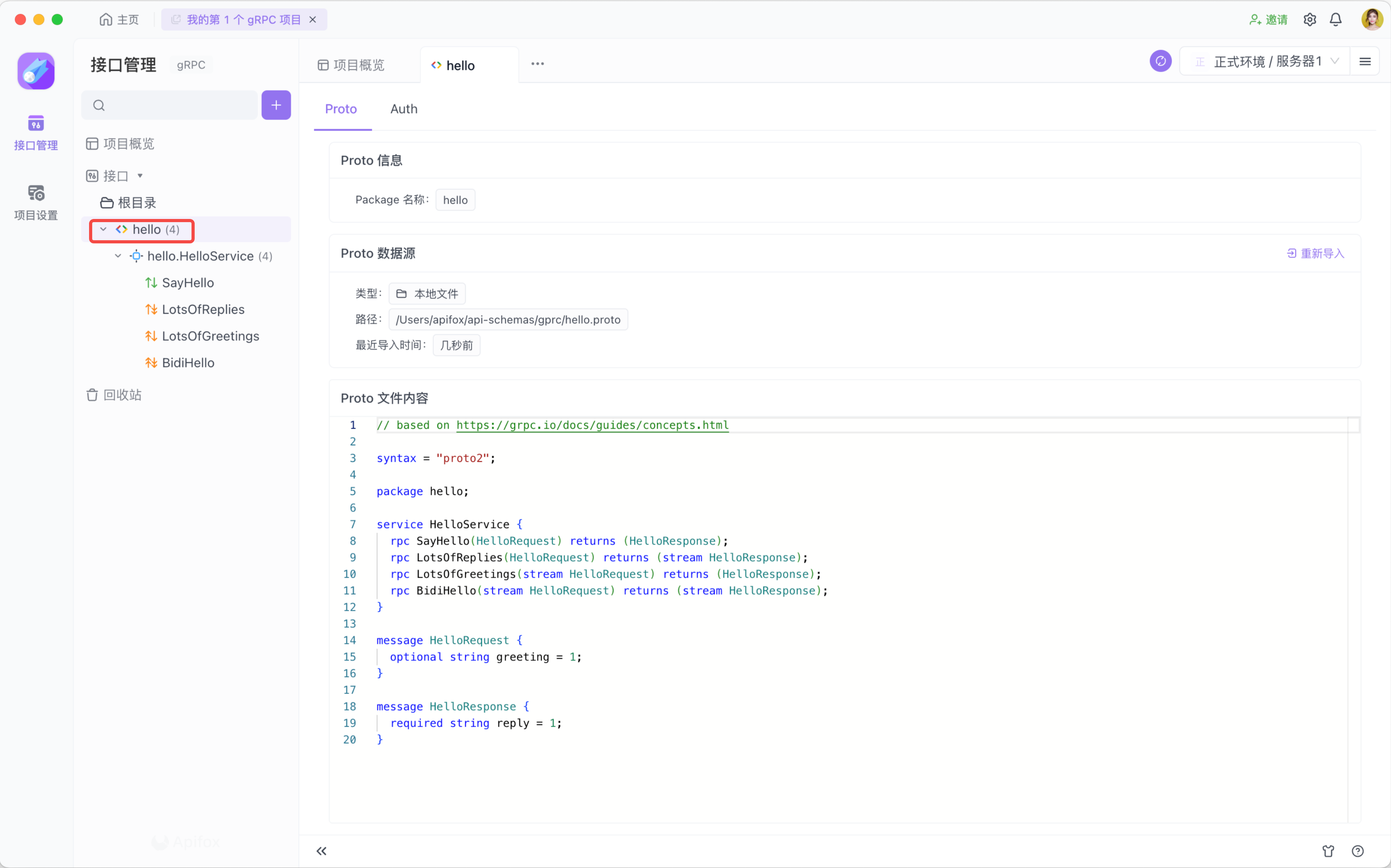 gRPC 是一种 API-First 的 API 技术,这意味着在开发之前,必须先通过 .proto 文件来定义服务、方法和消息。因此,使用 Apifox 调试 gRPC 接口之前,也需要先导入作为 API 定义的 .proto 文件。