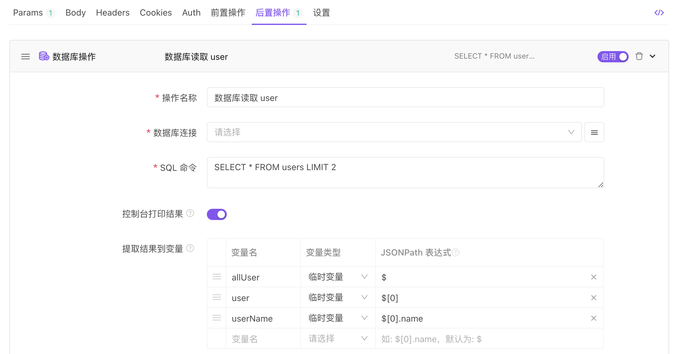 支持读取数据库数据,作为接口请求参数使用。支持读取数据库数据,用来校验(断言)接口请求是否成功。
