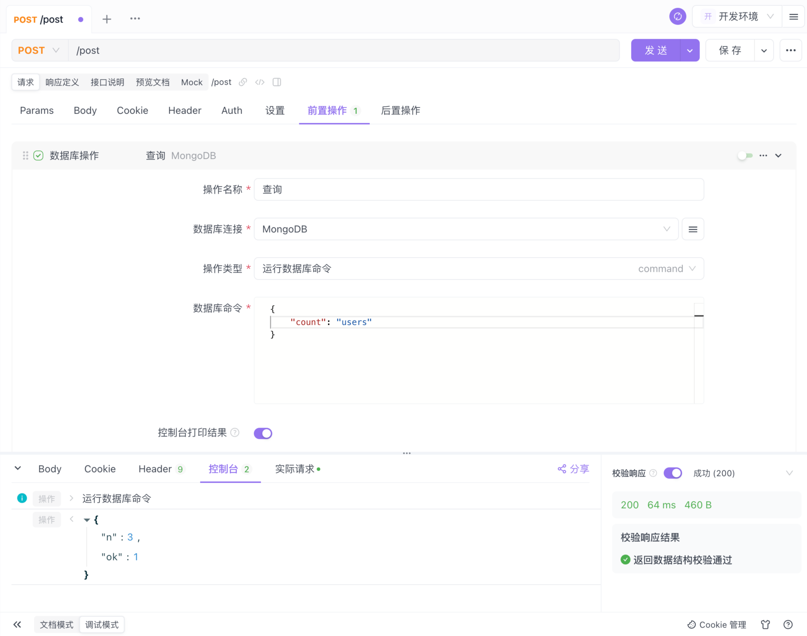 例如针对上文提到的查询操作,输入命令并开启”控制台打印结果“后,就可以在控制台查看查询到的文档。