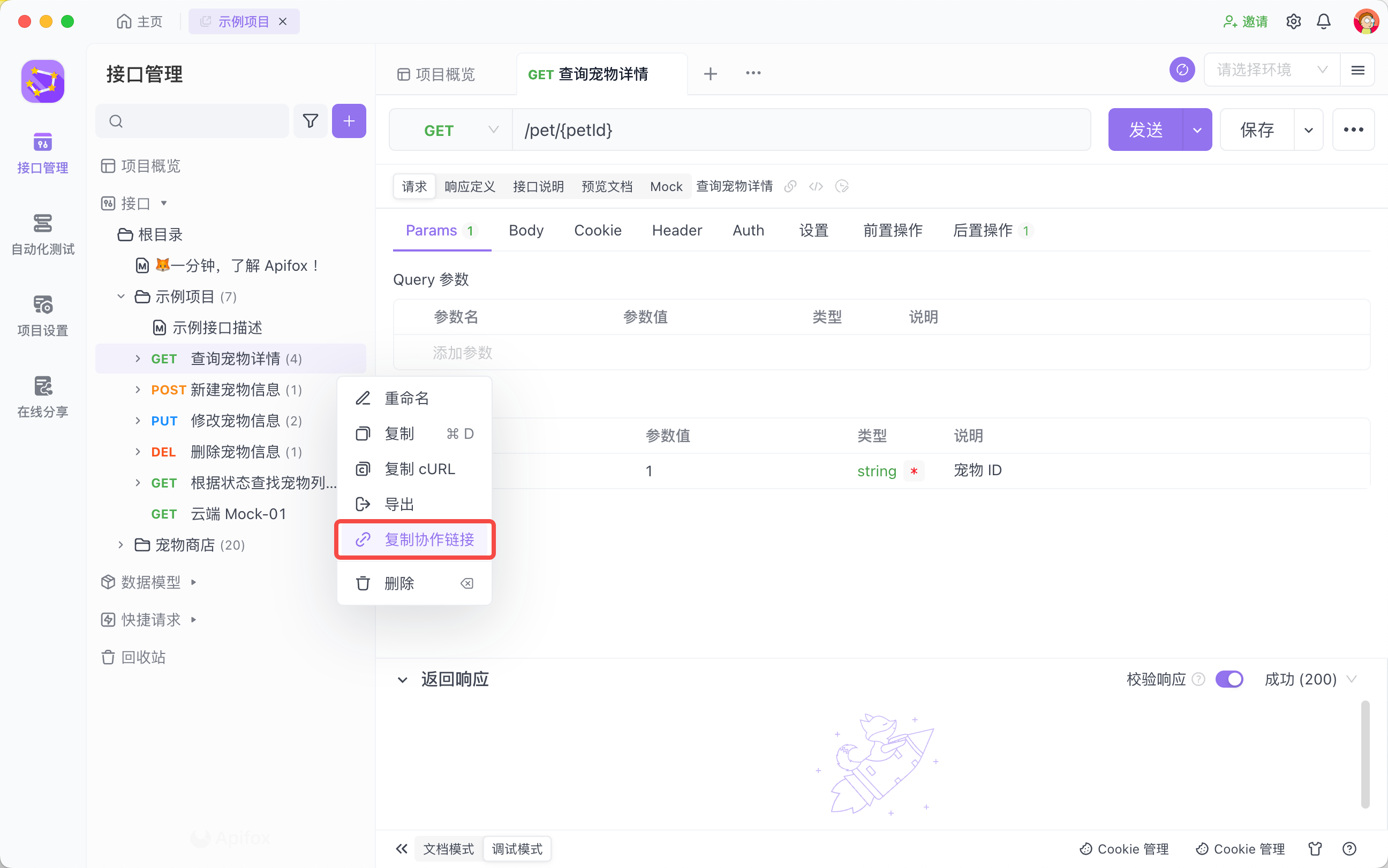 轻点接口右侧菜单栏中的「复制协作链接」按钮,即可生成一个协作链接。将它发给其它团队成员,打开链接后即可直接在 Web 端中定位到对应的接口。