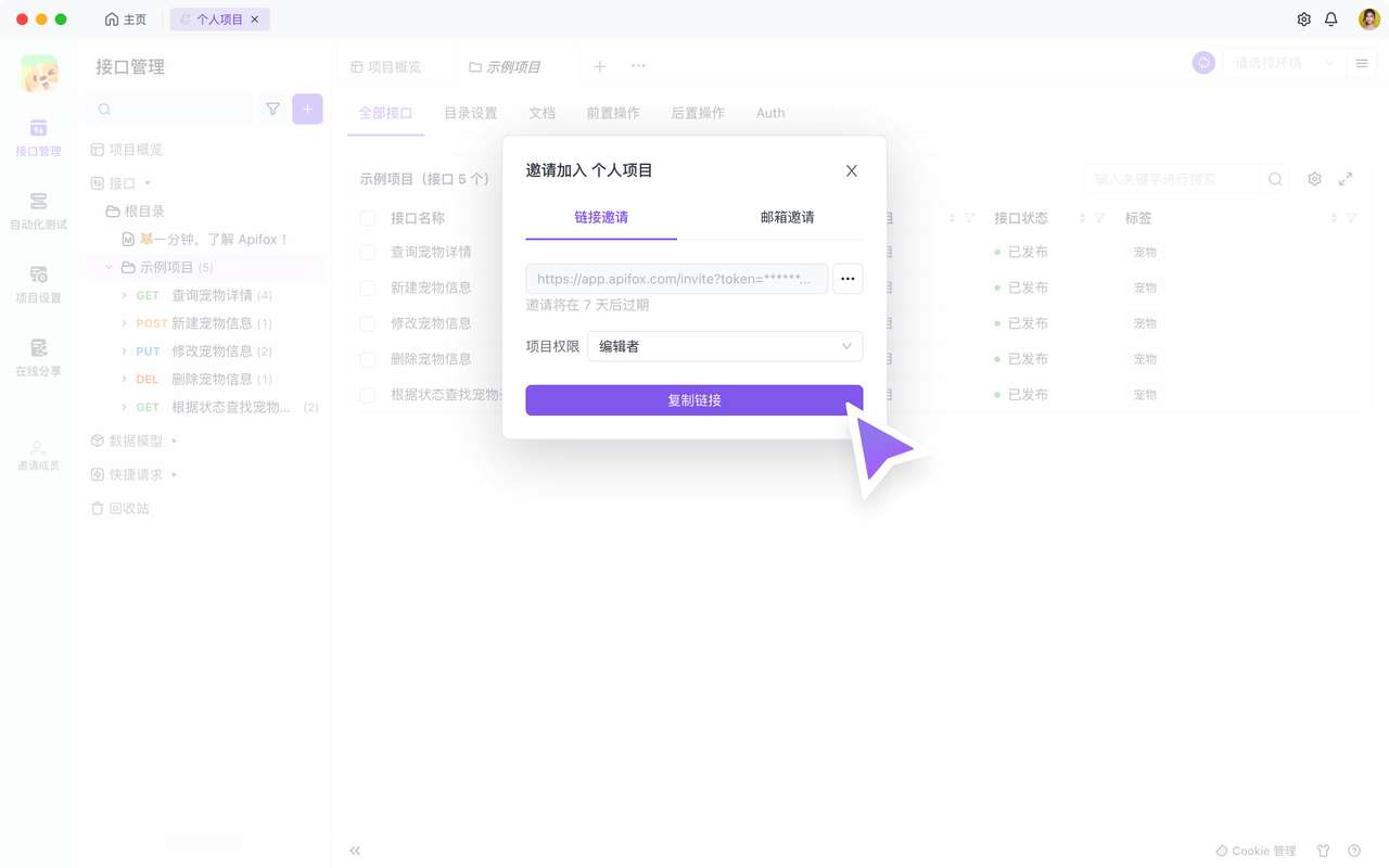 Apifox 提供了两种邀请方式,让你方便地邀请团队成员: