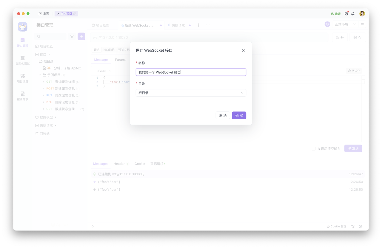 WebSocket 接口功能要求 Apifox 版本号 ≥ 2.2.32。